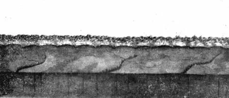 El siguiente grabado representa una vista seccional del suelo en donde se ha pasado el rodillo después del arado.