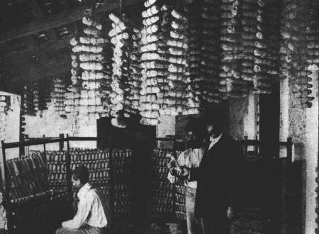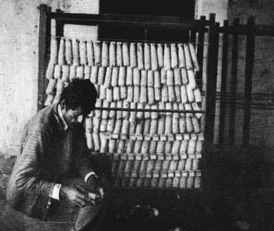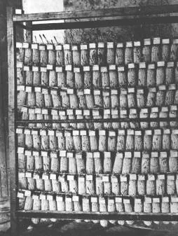 Así se procede con los demás alambres hasta concluir un lado del aparato, o sea después de colocar doscientas mazorcas. Se procede a llenar la otra mitad, lo que hace un operario en poco tiempo, quedando listo el aparato germinador. El siguiente grabado representa el trabajo con todos sus detalles.