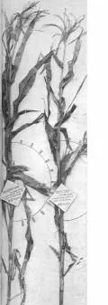 Dos cañas que representan el resultado de sembrar las mazorcas que primero se doblan comparadas con otras que no tienen esta cualidad. Sembrando persistentemente las que primero se doblen se obtiene una variedad muy valiosa, pues se evita que las lluvias pudran e! maíz y además es una defensa contra los efectos de las primeras heladas.