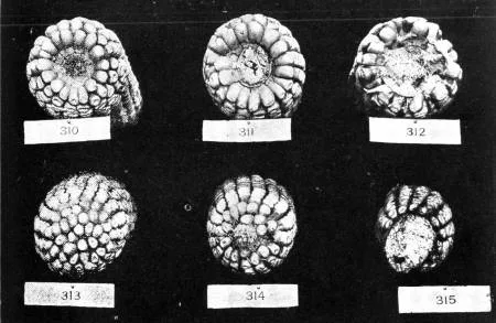 Los números 310 y 313 son las dos extremidades de una mazorca muy bien constituida, los números 311 y 314 medianamente bien formada y los números 312 y 315 muy mala.