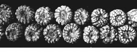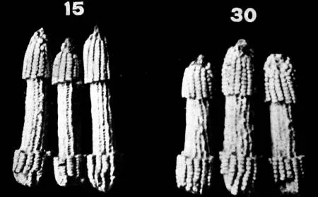 Una vez escogidas las cien mazorcas con que se van á comenzar sus trabajos de selección o cría, se toman 150 granos de cada una de las mazorcas dejando el resto de los granos en la misma y poniendo un número en la forma que indica la ilustración siguiente.